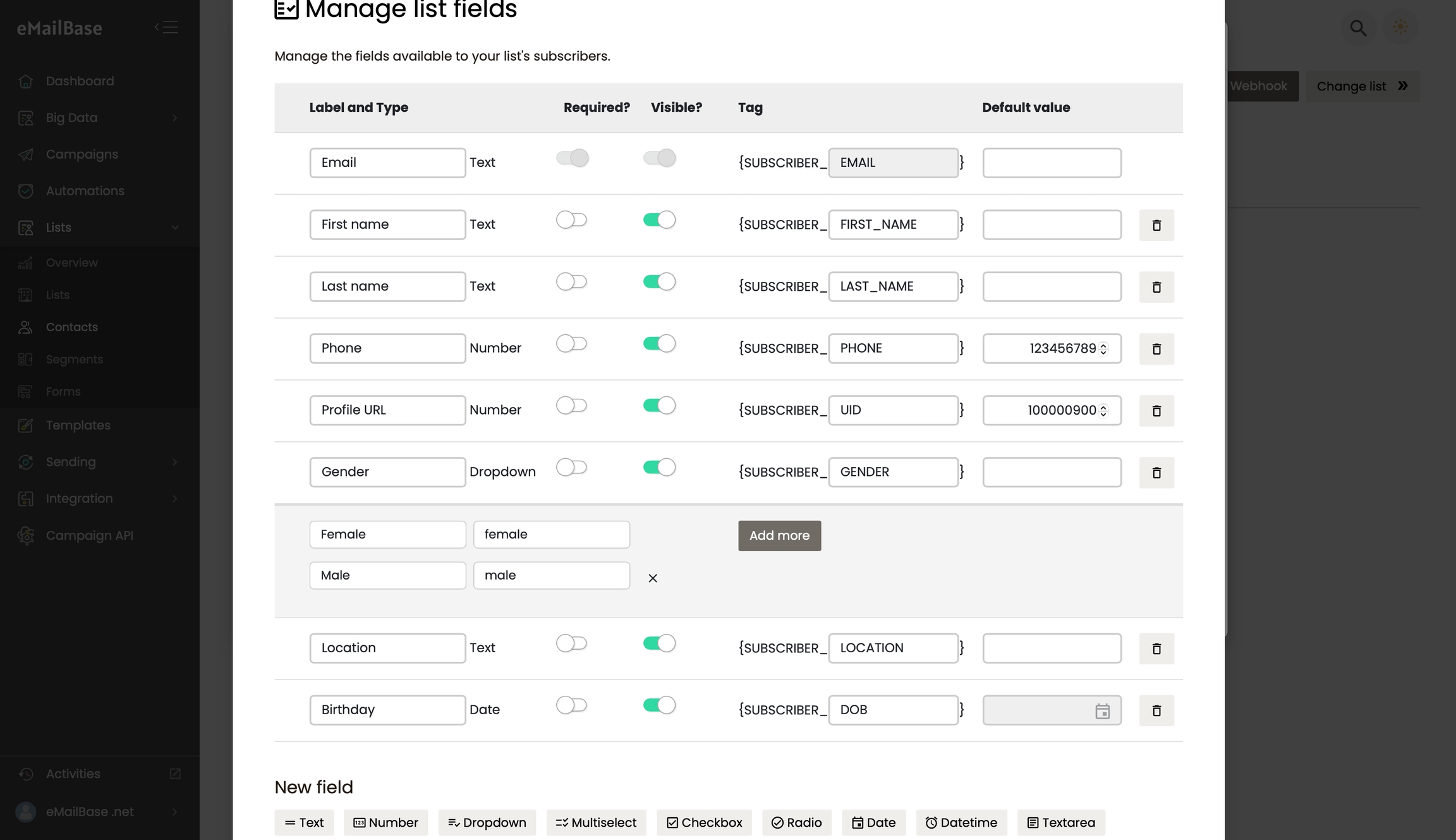 Nếu các trường cần thiết chưa tồn tại trong danh sách của bạn, chọn Manage List Fields và tạo các trường mới theo hướng dẫn chi tiết trong phần Manage List Fields.