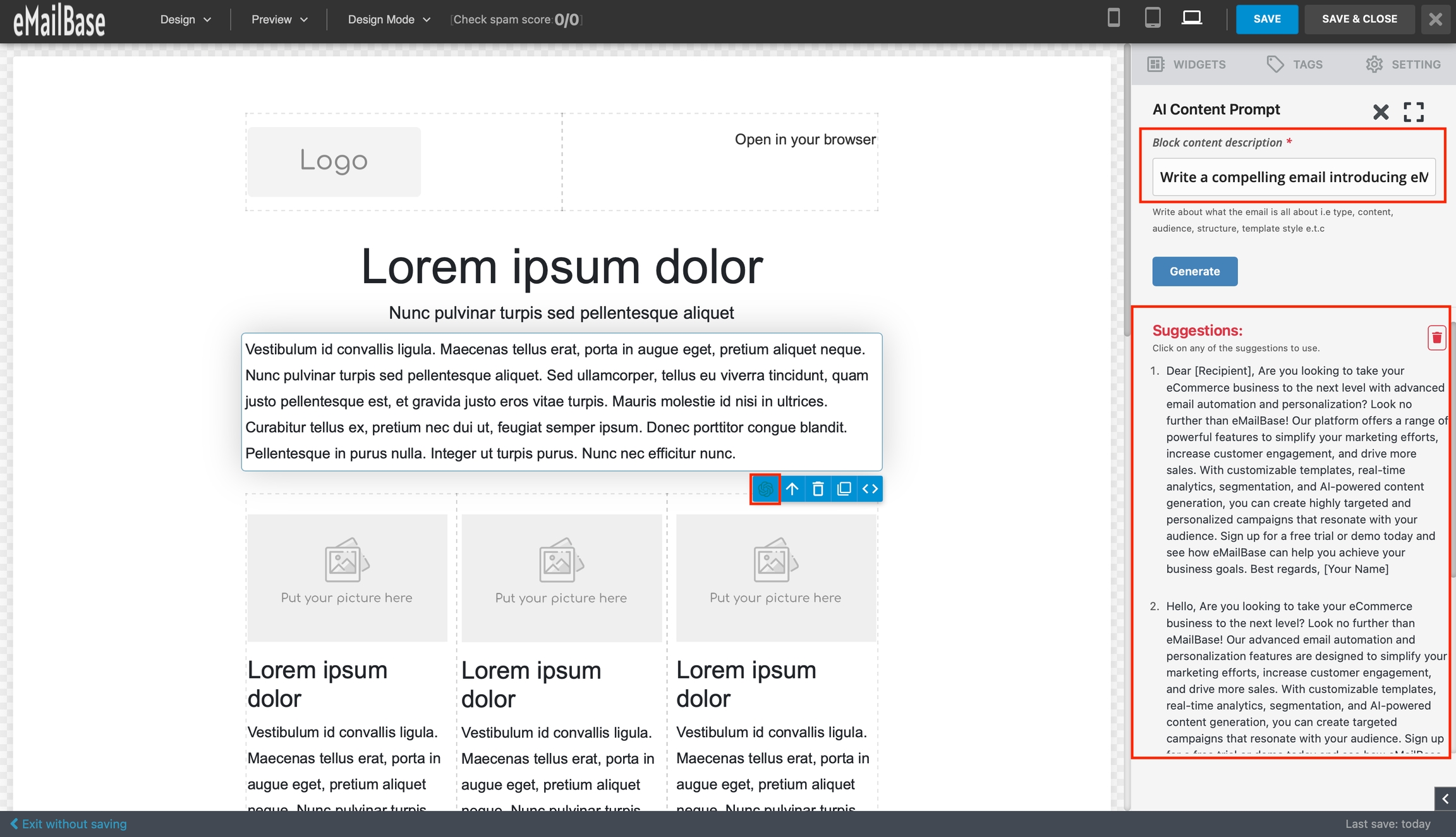 Tính năng Tạo Nội dung Email AI trong eMailBase sử dụng AI (ChatGPT) để giúp bạn tạo ra các tiêu đề email và nội dung nhanh chóng và hiệu quả. Công cụ này được thiết kế để đơn giản hóa quy trình tạo email của bạn bằng cách cung cấp nội dung phù hợp, hấp dẫn và được cấu trúc tốt dựa trên đầu vào của bạn.